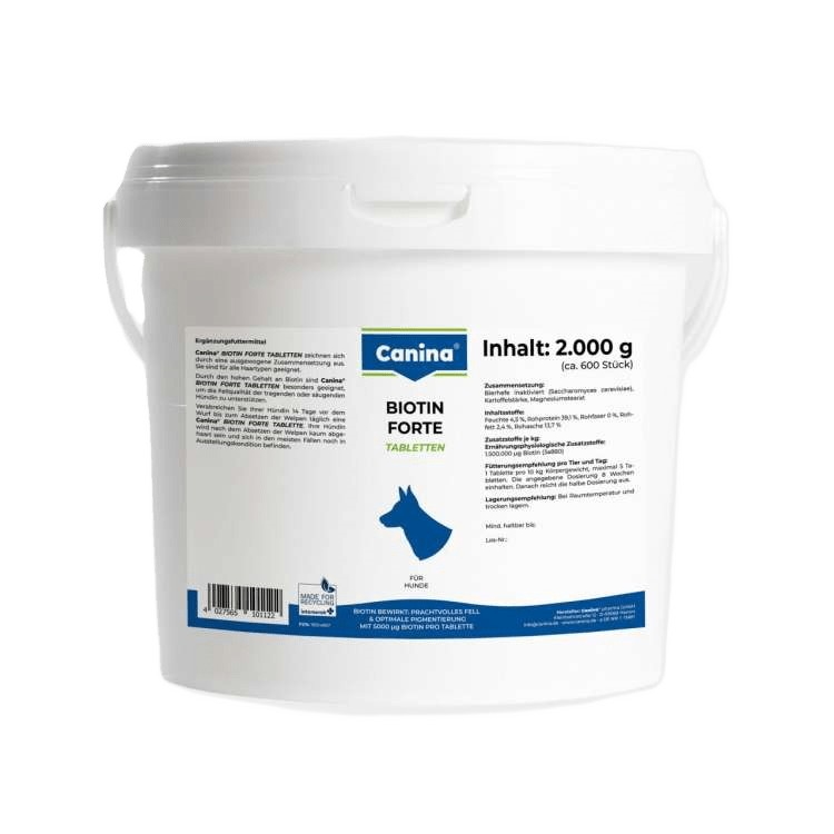 Сбалансированная кормовая добавка с высоким содержанием биотина и витаминов В группы для собак. Была разработана специально для животных, которым не хватает биотина. Первыми признаками этого является сухая, ломкая шерсть с отсутствием блеска, перманентная лень, перхоть, зуд. Canina «Biotin Forte» помогает преодолеть эту недостачу, и придать шерсти питомца блеск и здоровье.