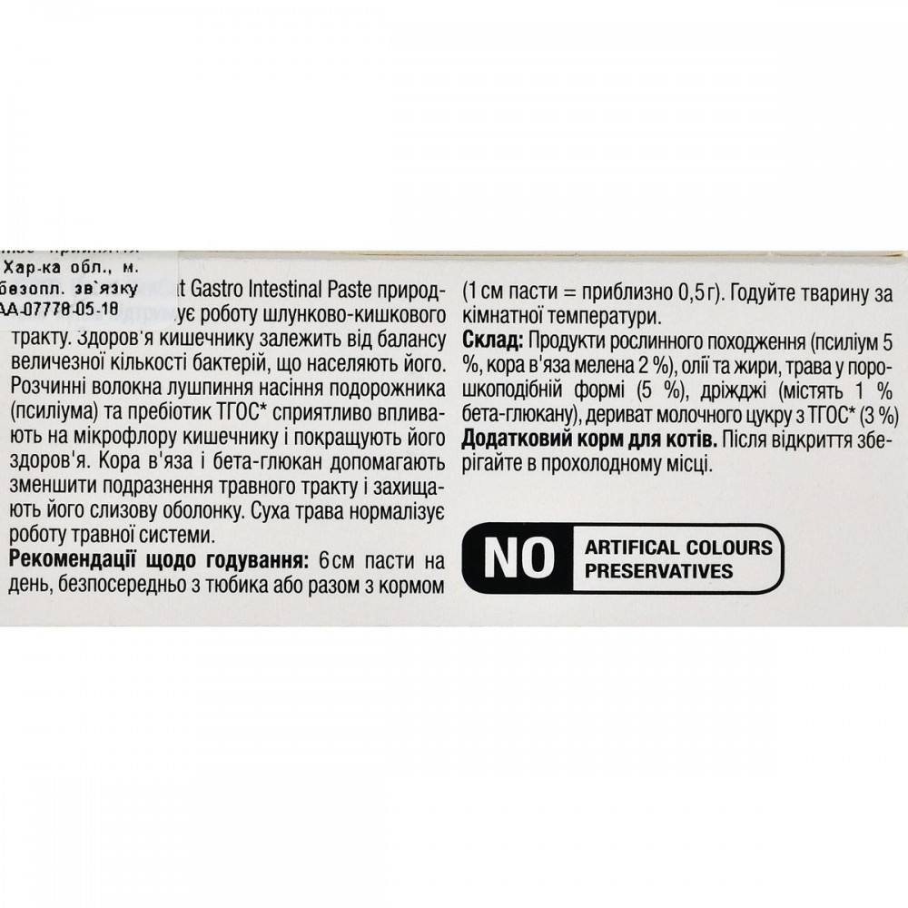 Паста Expert Line Gastro Intestinal для покращення травлення, 50 г, д/котів, застосовується в якості харчової добавки для дорослих котів всіх порід. Вона природнім шляхом підтримує діяльність шлунково – кишкового тракту, зменшує подразнення травної системи, за рахунок збалансованої кількості поживних бактерій.