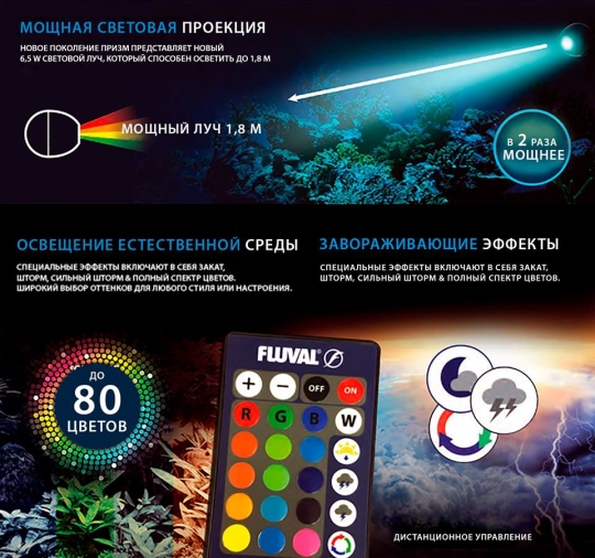 Имеет разнообразные эффекты: заказ Солнца, шторм и автоматическое управление полным спектром цвета