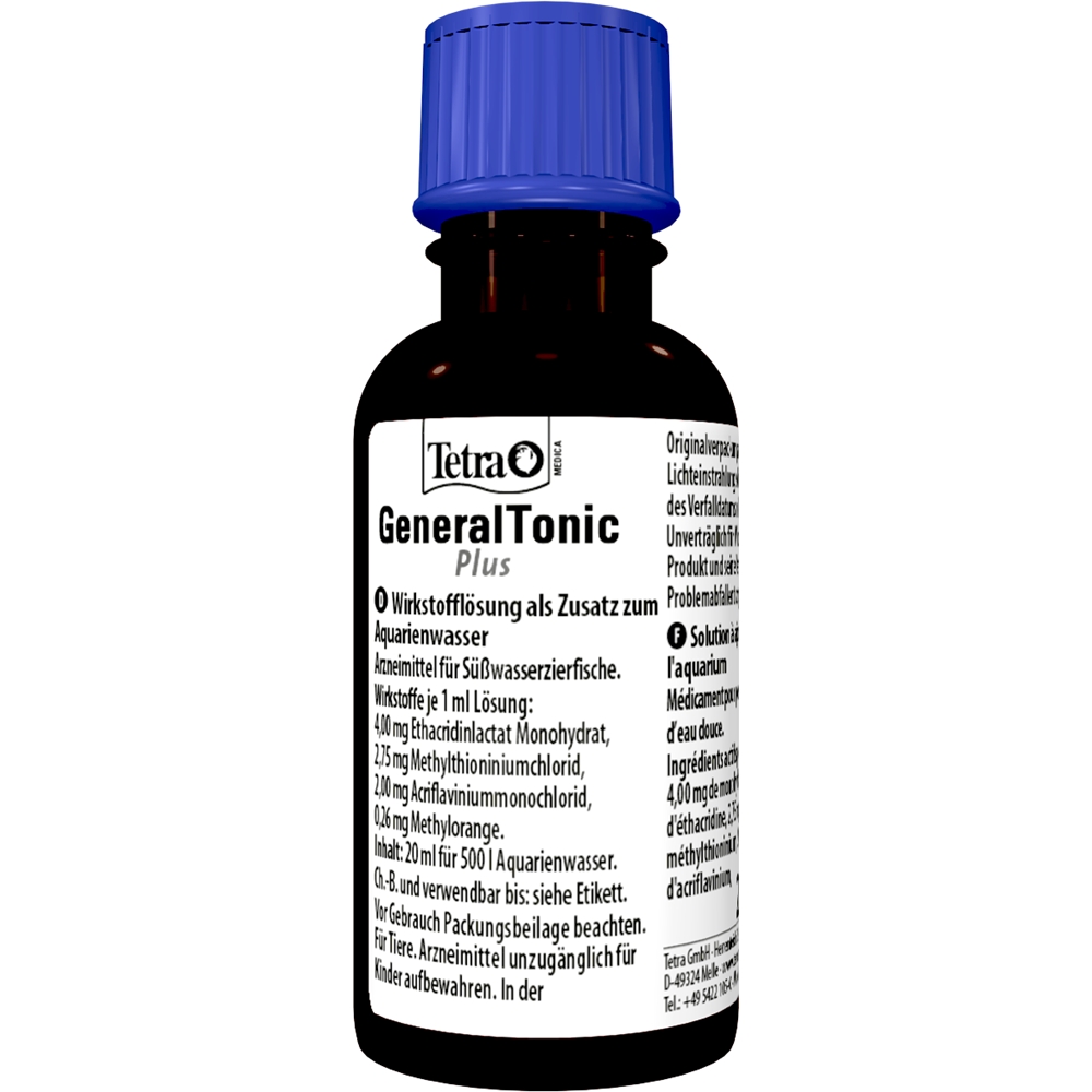 Багатофункціональний засіб проти найбільш поширених хвороб риб Tetra Medica General Tonic Plus відмінно справляється зі своїм завданням. Завдяки активним інгредієнтам водні мешканці швидко поправляються, а саме в 1 мл розчину: 4,00 мг моногідрату лактату етакрідіна, 2,75 мг метілтіонінія хлориду, 2,00 мг акрифлавіну хлориду, 0,26 мг метилоранжа.