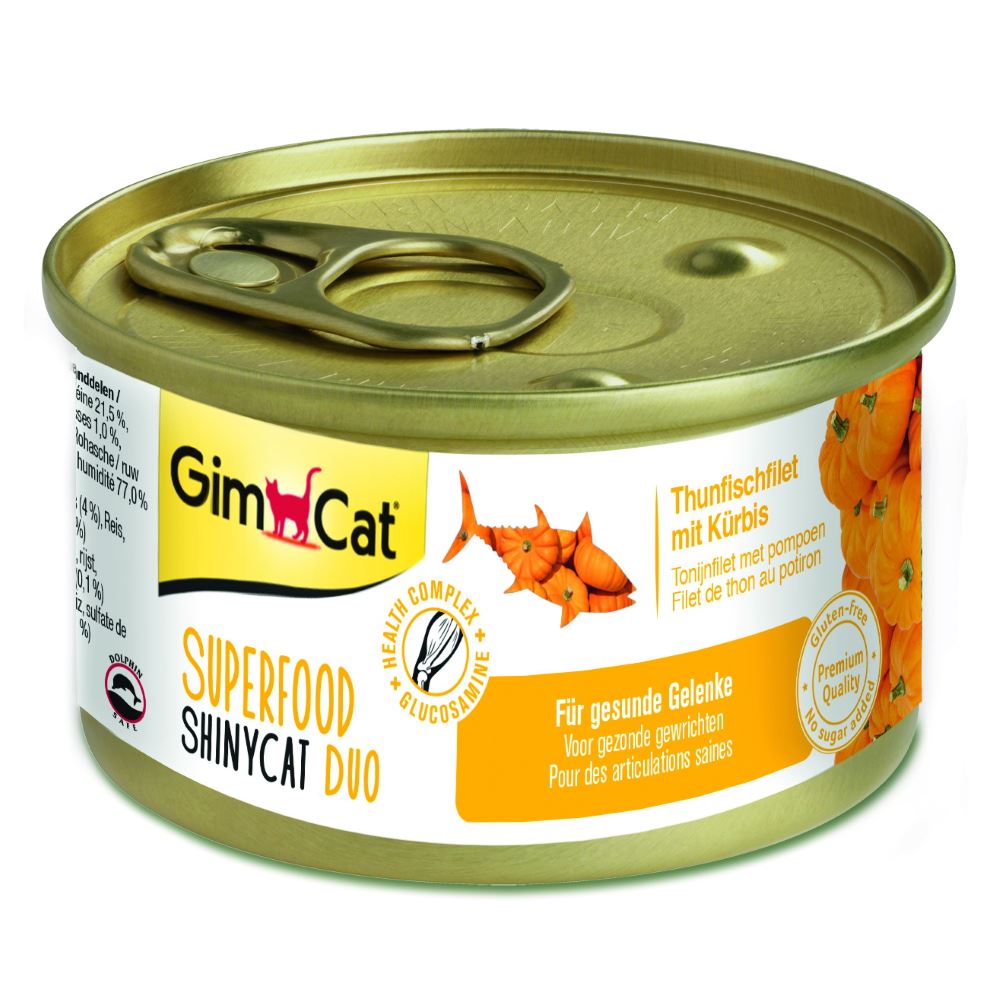 Shiny Cat Superfood – це вологий корм суперпреміум класу для котів. Ніжне філе тунця, збагачене гарбузом, забезпечує високий вміст білка та легке засвоєння. До складу додано хондроїтин і глюкозамін для підтримки суглобів. Не містить барвників, консервантів та цукру.