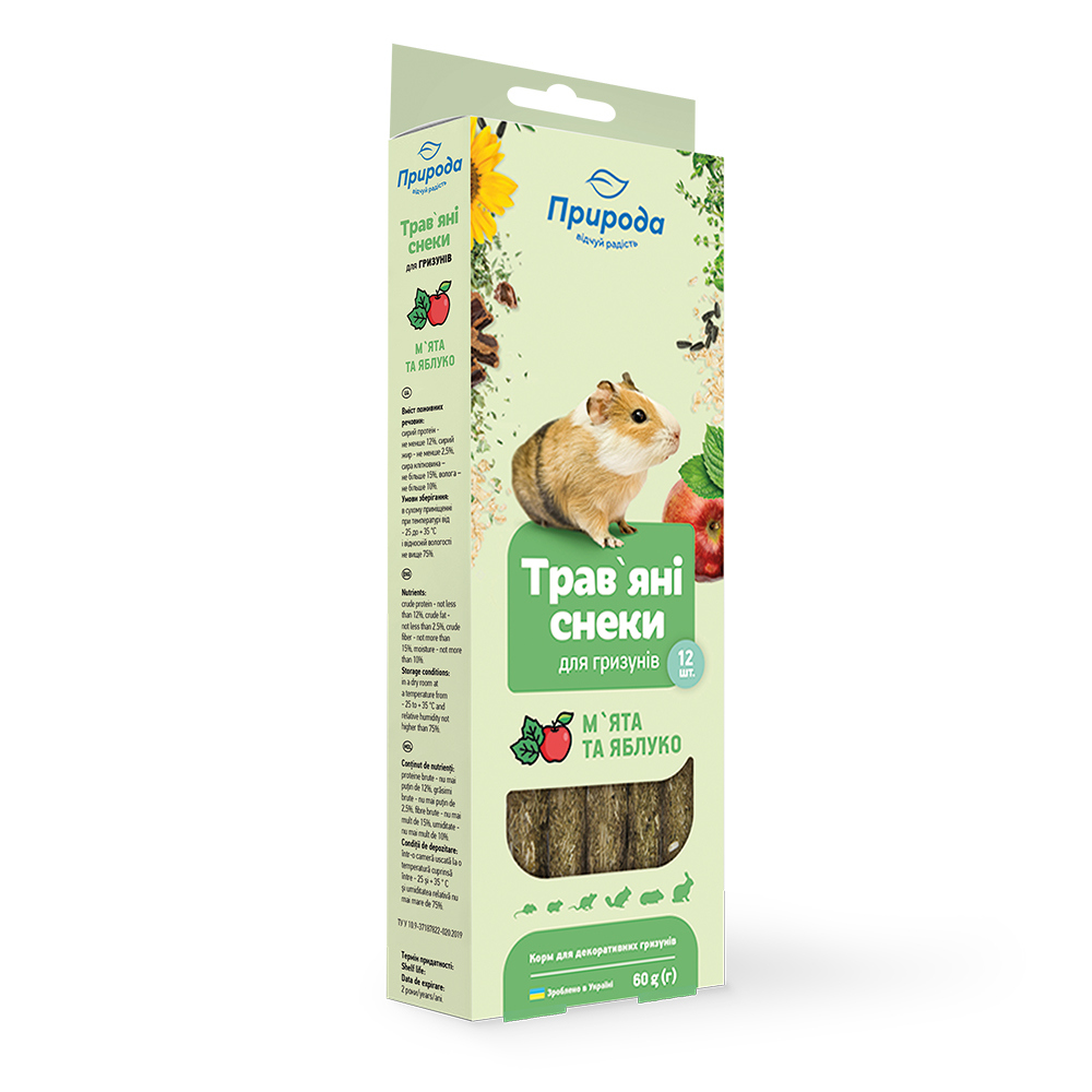 Трав’яні снеки «М’ята та яблуко» – корисні натуральні ласощі для домашніх гризунів, а також засіб для сточування зубів. Підходить для шиншил, дегу, кролів, морських свинок, хом'яків, пацючків.