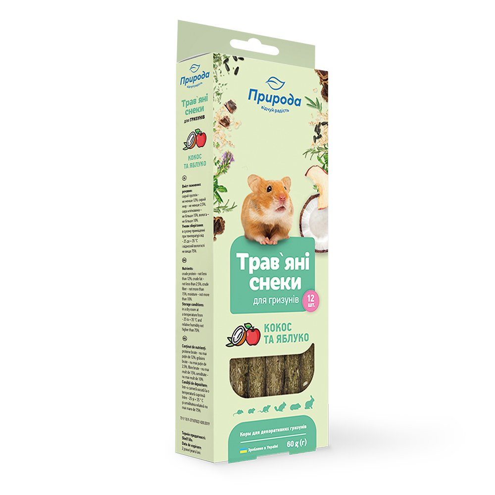 Трав’яні снеки «Кокос та яблуко» – корисні натуральні ласощі для домашніх гризунів, а також засіб для сточування зубів. Підходять для шиншил, дегу, кролів, морських свинок, хом'яків, пацючків