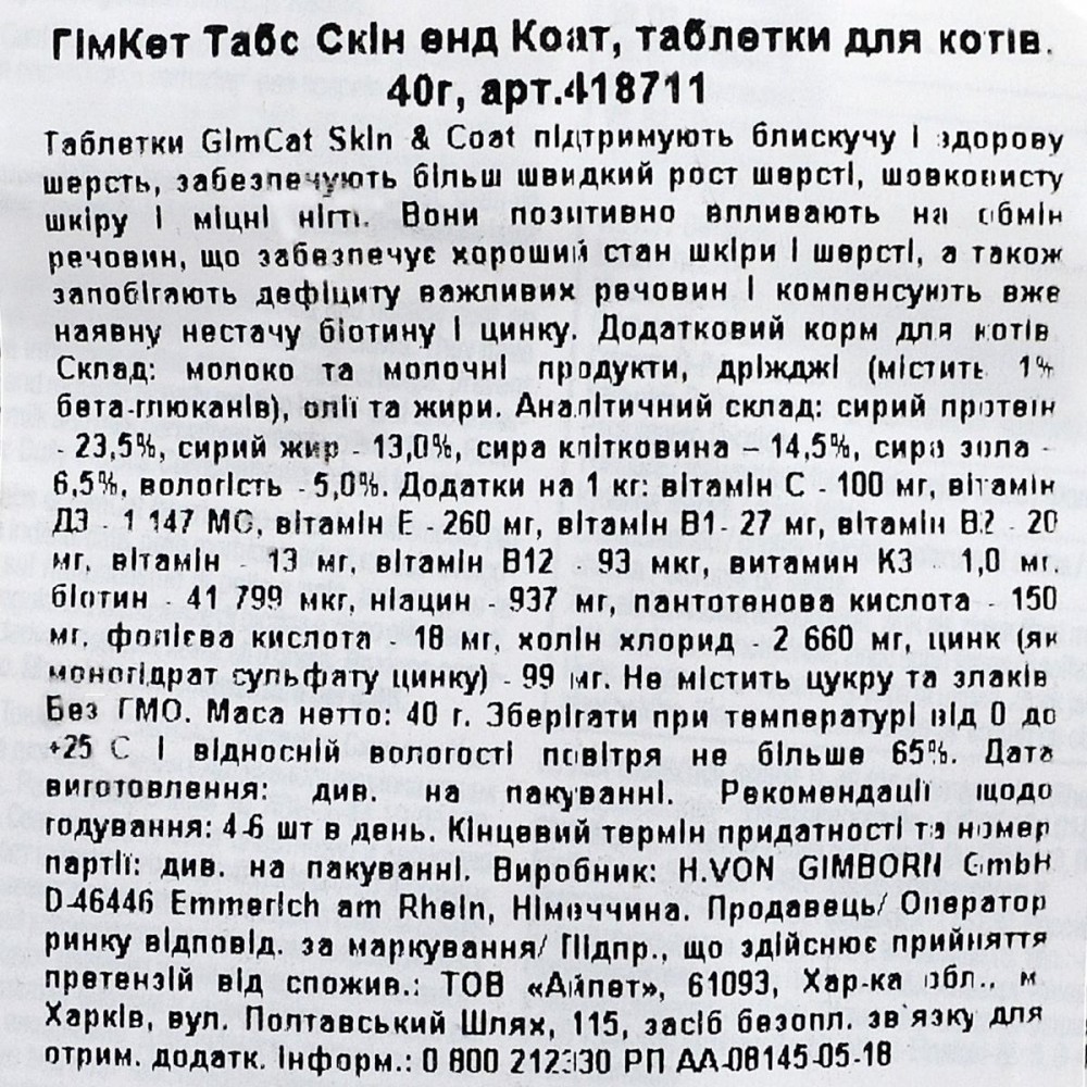 Вітамінна добавка для котів GimCat Every Day Skin and Coat таблетки для здорової шерсті 40г