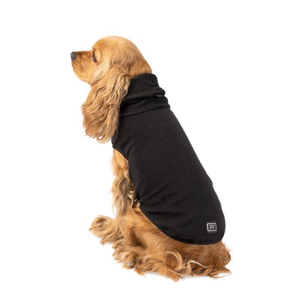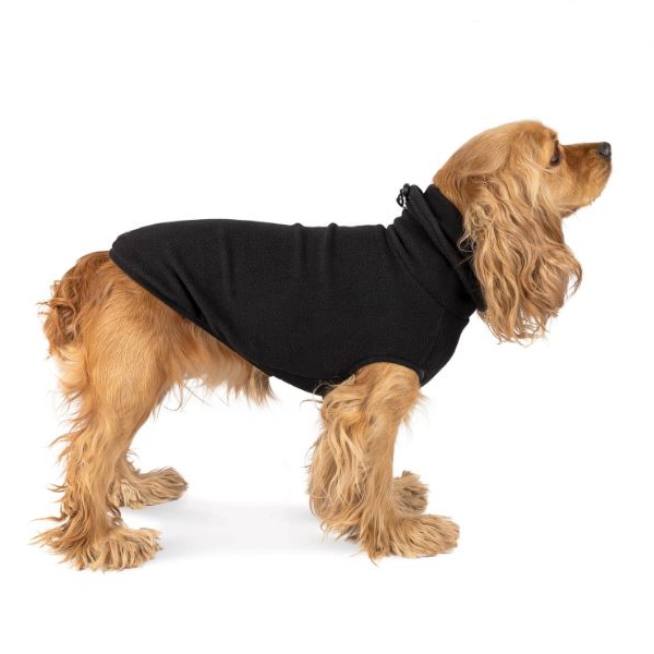 В холодную погоду оптимальный вариант – желтый жилет в комплекте с теплым флисовым свитером черного цвета. Это дополнительны комфорт и безопасность. Свитер изготовлен из мягкой эластичной ткани, поэтому он хорошо сидит. Высокий воротник дополнен резинкой с фиксатором – так модель еще лучше греет и защищает шею любимца от холода и резкого ветра. Для спаниелей такой крой особенно удобен – воротник не только надежно защищает ушки от холода, но и не дает им намокнуть и испачкаться.