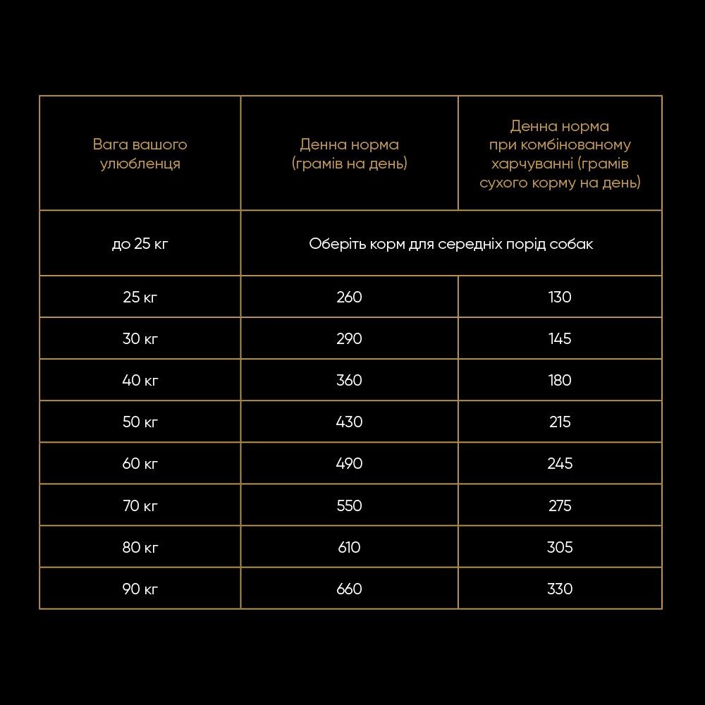 Вага вашого улюбленця  Денна норма (грамів сухого корму на день) Денна норма при комбінованому харчуванні (грамів сухого корму на день)