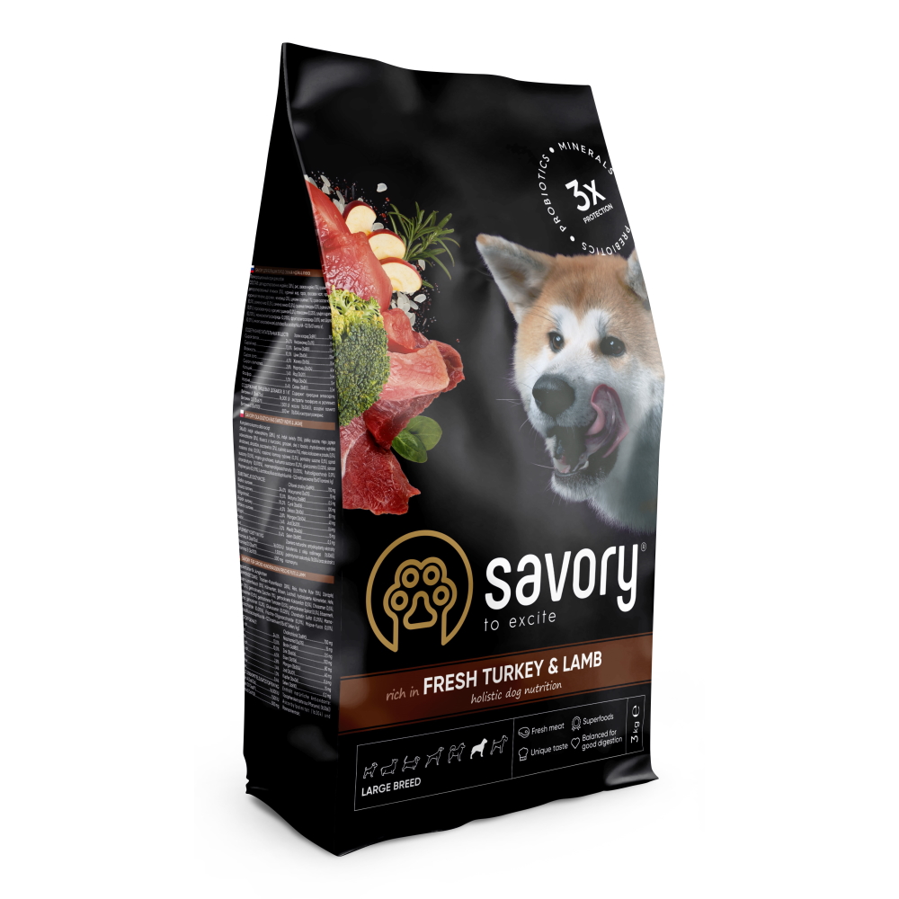 Каталог товаров : Сухий корм для собак > Сухий корм для собак великих порід Savory Large з ягням та індичкою 3кг