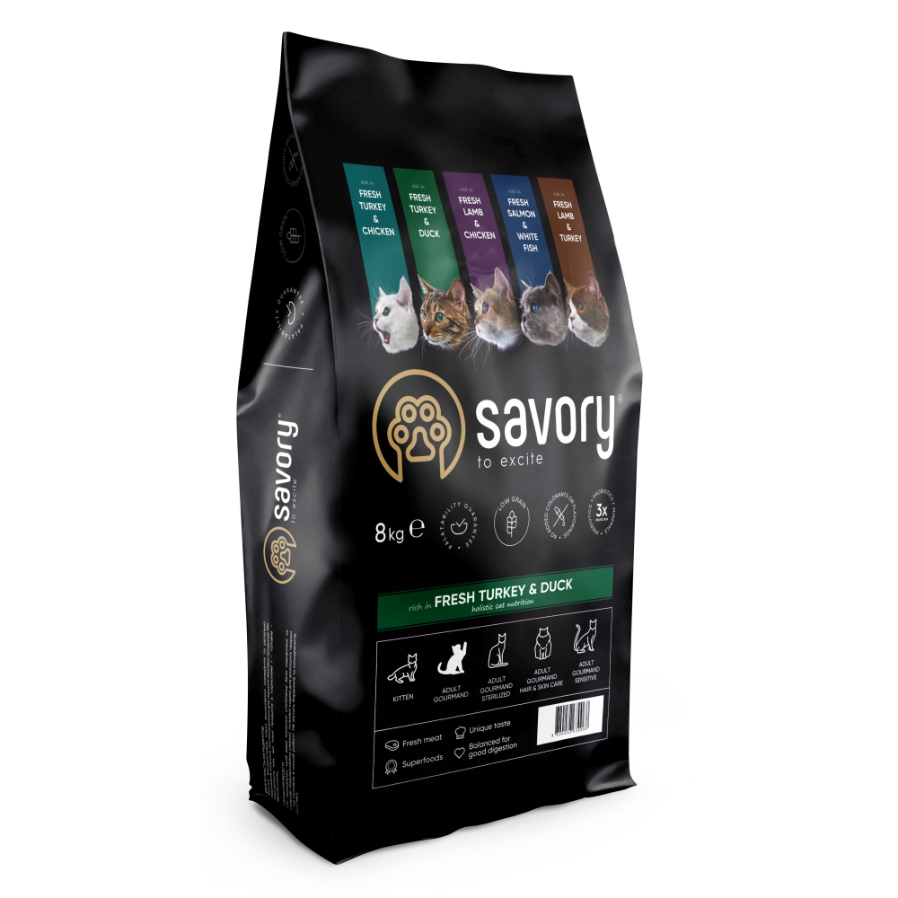 Сухой корм для кошек Savory содержит свежее мясо индейки и дегидратированное мясо утки, ягоды, фрукты и овощи. Эти компоненты созданы природой, чтобы обеспечить коту для крепкое здоровье и энергию для ежедневных развлечений.