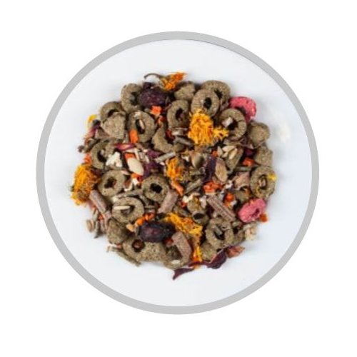 Склад: трав’яний гранулят в асортименті, комбікорм, протеїново-мінеральний гранулят, овес голозерний, ячмінь, чечевиця червона, кероб подрібнений, злаково-овочевий гранулят, пшениця повітряна, сушений пастернак, сушений гарбуз, сушена морква,  коріння кульбаби, шипшина, сушене яблуко, гібіск, насіння льону, насіння гарбуза очищене, сушений буряк, квіти календули.
