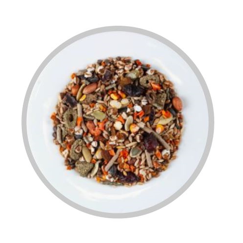 Склад: пшениця, ячмінь, комбікорм, овес голозерний, гречка, пшениця повітряна, сорго,  маїс, рис червоний, сушений гарбуз, насіння гарбуза очищене, насіння соняшнику, трав’яний гранулят в асортименті, арахіс, горохові пластівці, сочевиця, кероб подрібнений, сушені яблука, шипшина, сушена морква, виноград сушений.