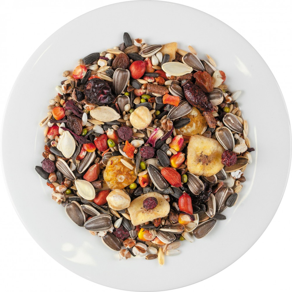 Склад: овес голозерний, маїс, насіння соняшнику чорного, насіння соняшнику сірого, ячмінь, гречка, сафлор, сорго біле, арахіс, насіння конопель, боби мунг, фрукти гранульовані, насіння гарбуза, рис неочищений, пшениця повітряна, глід, виноград сушений, бананові чіпси, фізаліс сушений, подрібнена ламінарія, насіння розторопші, кероб подрібнений, фундук, шипшина, гібіск, морква сушена, обліпиха сушена.