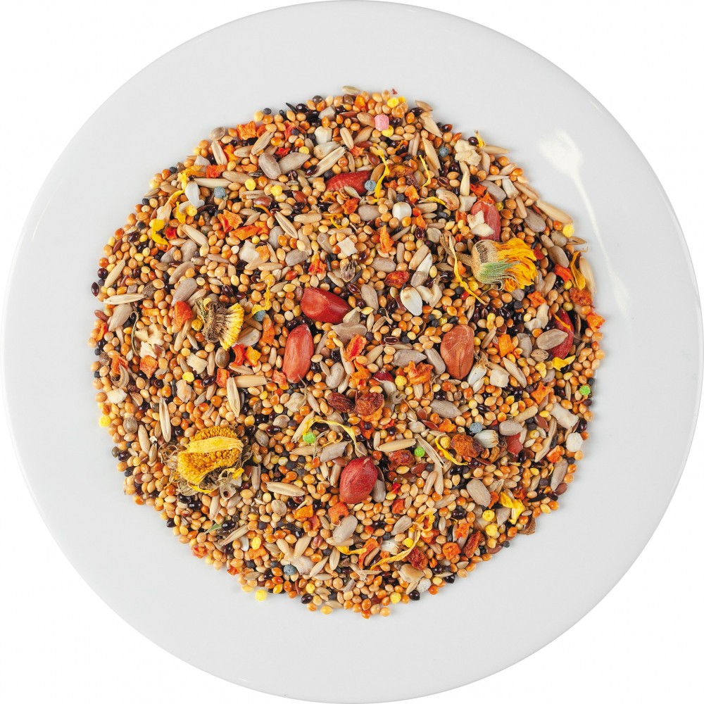 Склад: просо жовте, просо червоне, овес голозерний, просо чорне, канаркове насіння,  очищене насіння соняшнику, рапс, насіння льону, сушена морква, сафлор, абіссінський нуг, сушене яблуко, арахіс, насіння конопель, рисові кульки, обліпиха сушена, квіти календули.