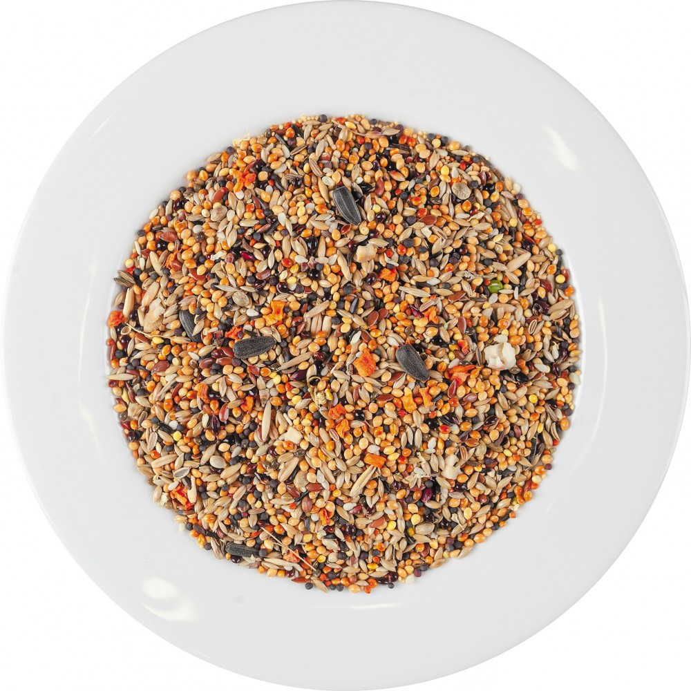 Склад: просо жовте, просо червоне, канаркове насіння, просо чорне, овес голозерний,  амарант, насіння льону, чумиза, рапс, абіссінський нуг, кунжут білий, суданська трава, насіння соняшнику очищене, сушене яблуко, сушена морква, насіння конопель, фенхель, квіти ромашки.