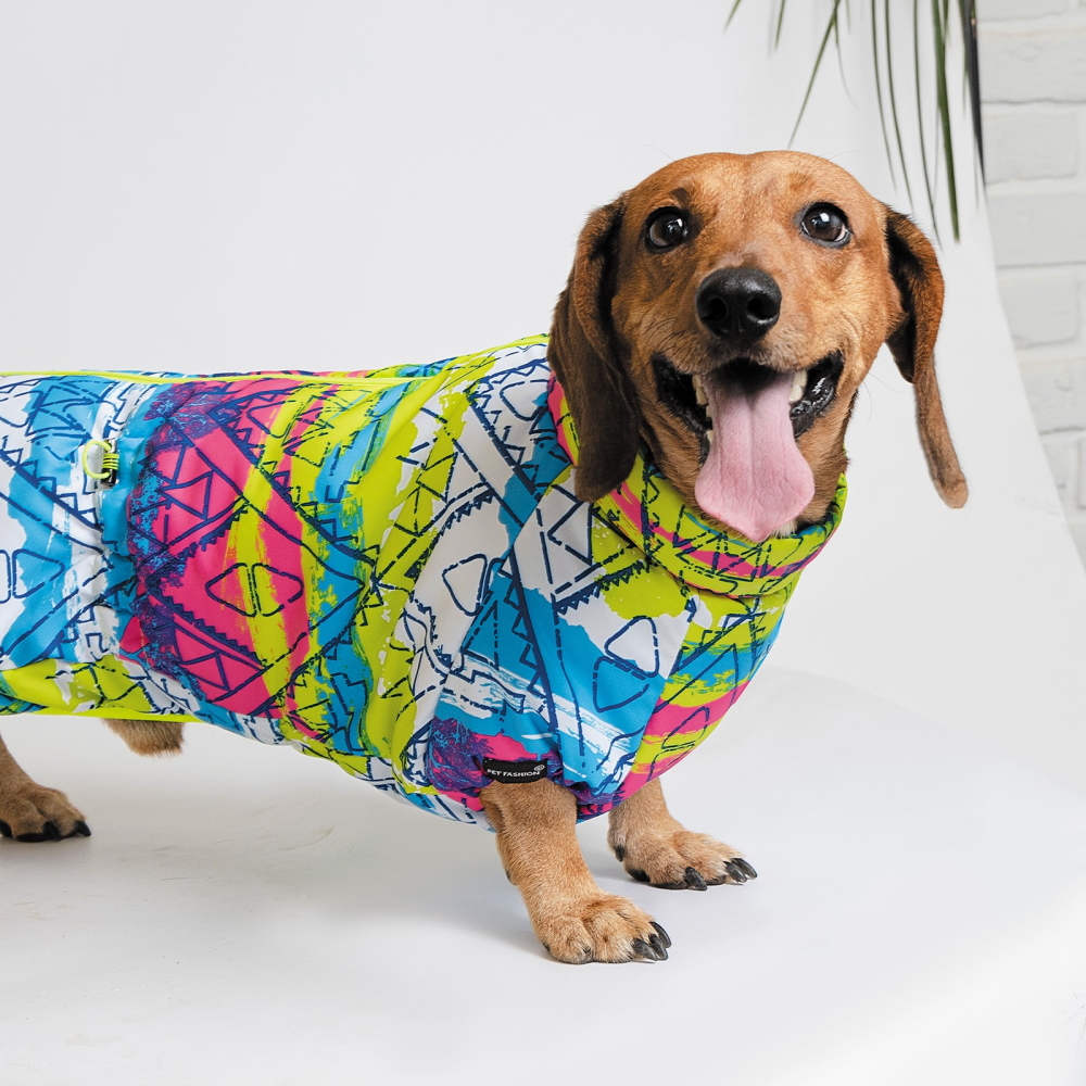 Яркий зимний комбинезон для такс сделает прогулки зимой еще более приятными и веселыми. Для максимального комфорта и идеальной посадки учтены все нюансы: короткие рукавчики, высокий воротник и две резинки с фиксаторами на поясе.
