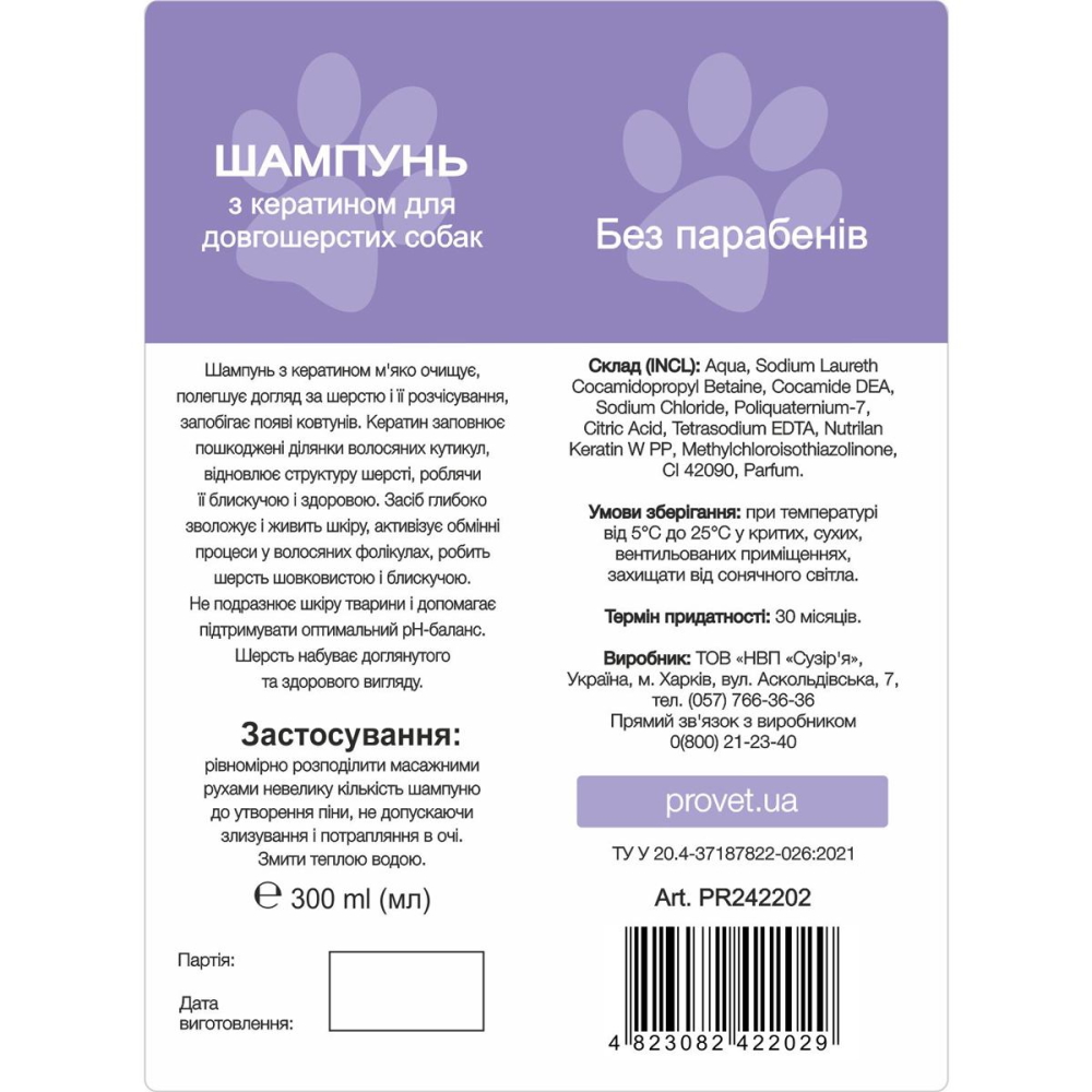 Описание: Шампунь с кератином мягко очищает, облегчает уход за шерстью и ее расчесывание, предотвращает появление колтунов. Кератин заполняет поврежденные участки волосяных кутикул, восстанавливает структуру шерсти, делая ее блестящей и здоровой. Шампунь глубоко увлажняет и питает кожу, активизирует обменные процессы в волосяных фолликулах, делает шерсть шелковистой и блестящей. Не раздражает кожу животного и помогает поддерживать оптимальный pH-баланс. Шерсть приобретает ухоженный и здоровый вид. Аромат- молочный миндаль.