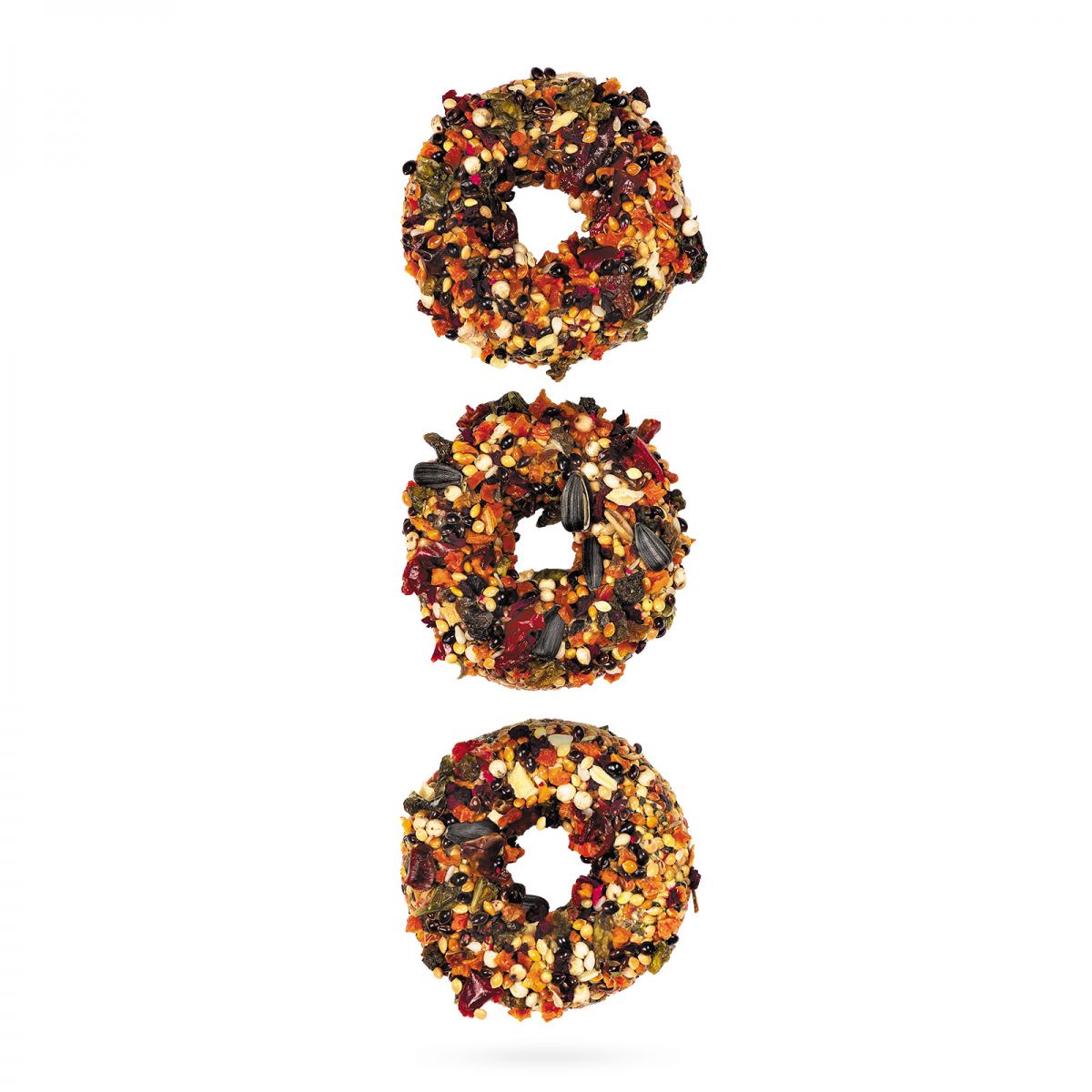 Рецептура ласощів розроблена спеціально для декоративних птахів, які утримуються в домашніх умовах. Смаколики чудово доповнюють раціон птахів корисними речовинами і дарують нові смаки. Паприка, сушена морква, кунжут білий та пастернак зміцнюють імунітет, покращують стан шкіри та оперення, прискорюють регенерацію. Пончик зручно кріпиться у клітці за допомогою спеціального тримача.