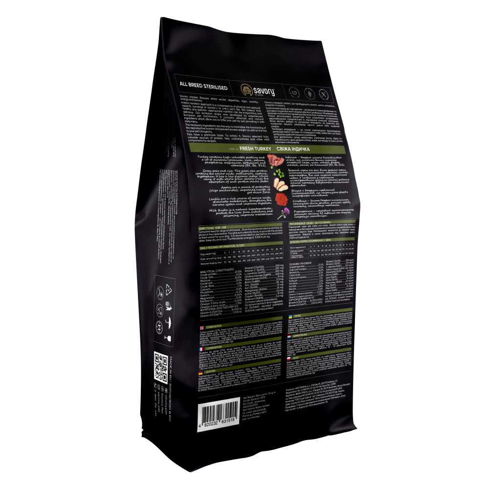 Каталог товаров : Сухий корм для собак > Сухий корм для стерилізованих собак усіх порід Savory з індичкою 12кг