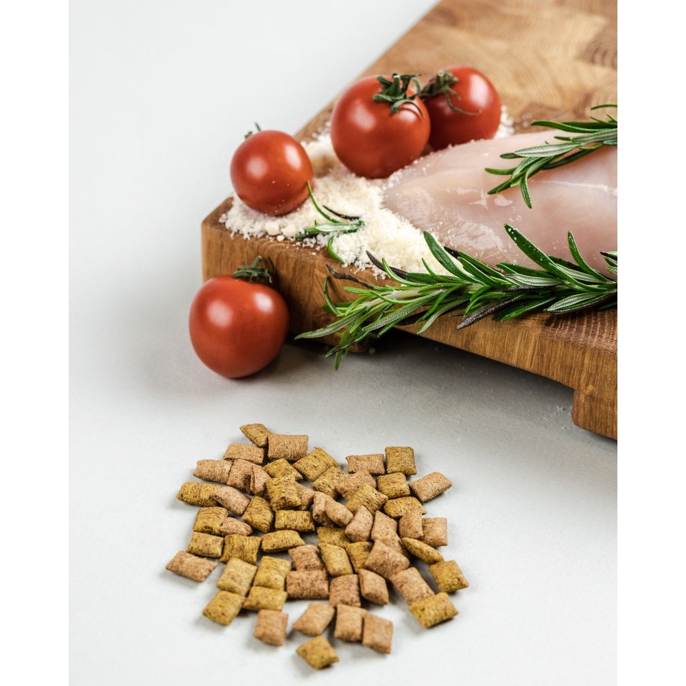 Состав: продукты растительного происхождения, мясо и продукты животного происхождения (14% курица), злаки, масла и жиры, экстракт растительного протеина, молоко и молочные продукты (4% творожная пудра), минералы.
