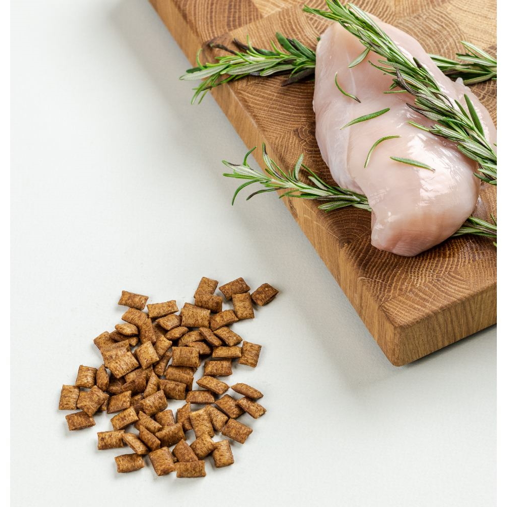 Состав: продукты растительного происхождения (в т. ч. 4% растительная клетчатка), мясо и продукты животного происхождения (в т. ч. 14% курица), злаки (в т. ч. 0.5% солод), растительные масла и жиры, экстракты растительных белков, минералов.