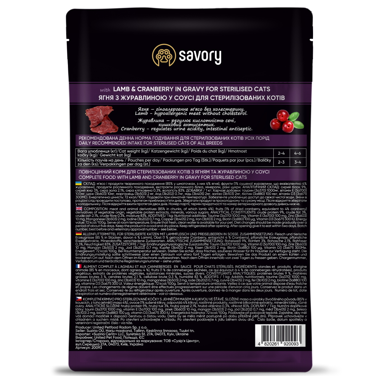 Ягненок – легкоусвояемый источник белка, не содержит холестерина и богат микроэлементами. Клюква – незаменимый продукт в рационе котов и кошек. Она имеет свойство подкислять мочу и регулировать таким образом ее кислотность – делает среду непригодной к образованию песка.