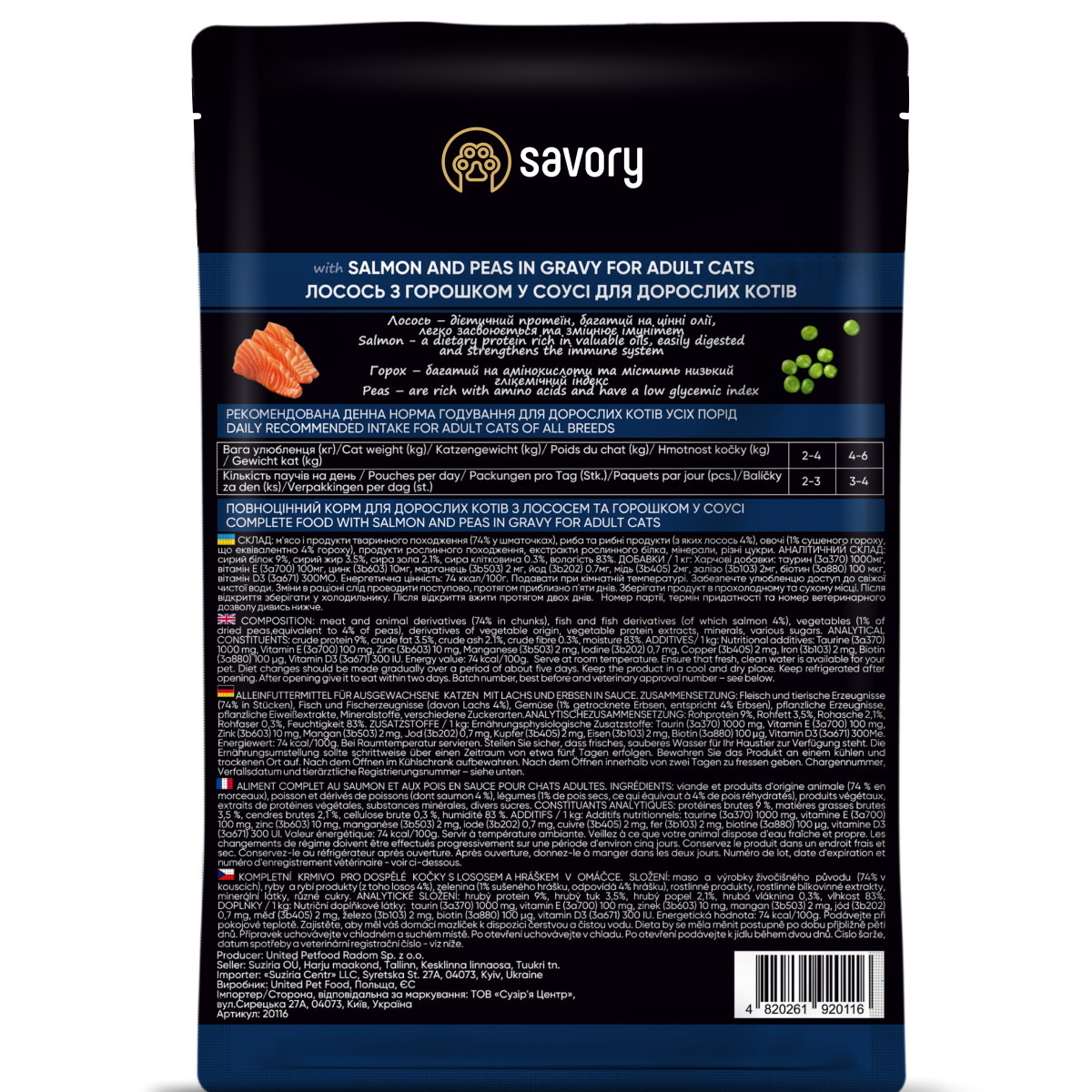 Каталог товаров : Консерви для котів > Влажный корм для котов Savory лосось с горошком в соусе 85г