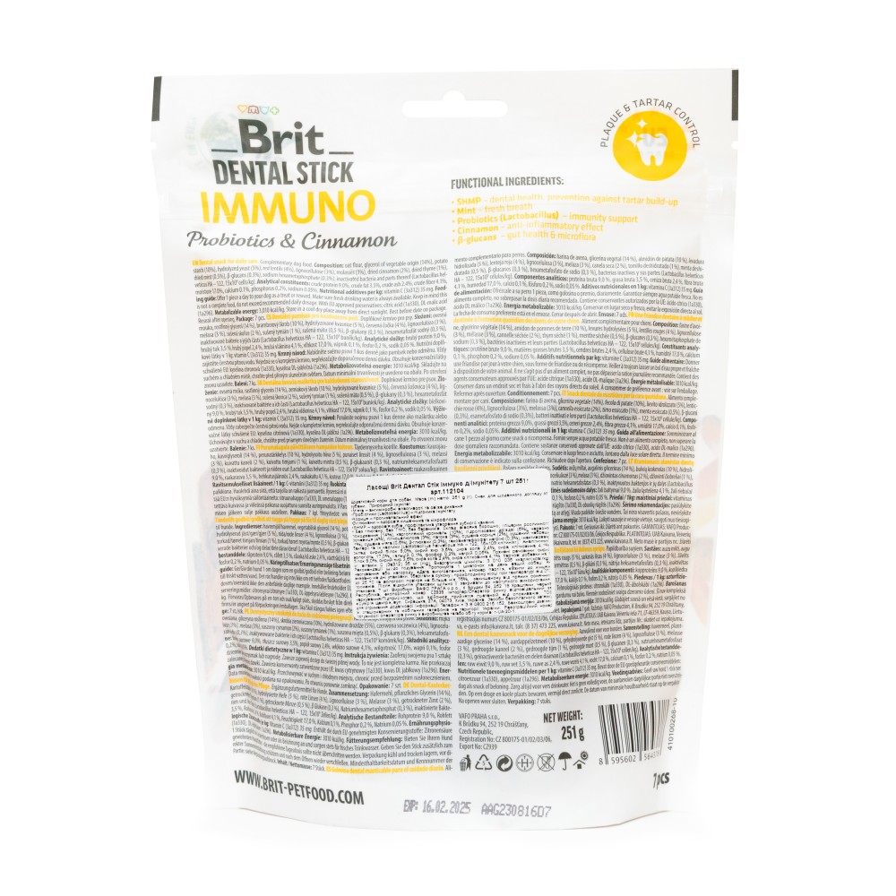 Brit Dental Stick спеціально створені для догляду за зубами песиків, ці функціональні ласощі ідеально підходять для щоденного споживання. Їхня структура розроблена для механічного очищення зубів, а гексаметафосфат натрію (SHMP) виконує функцію зубної пасти.