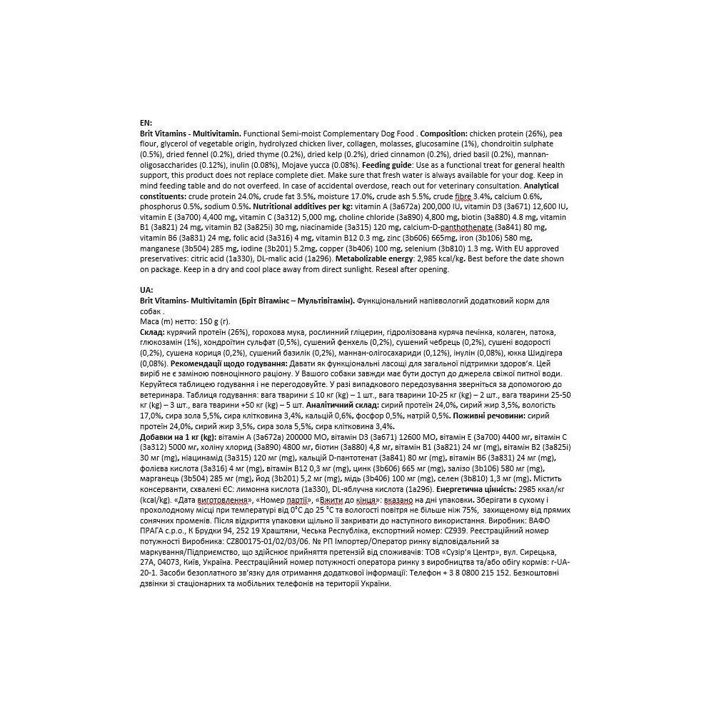 Каталог товаров : Вітамінні добавки та вітаміни для собак > Вітаміни для собак Brit Vitamins Multivitamin для міцного імунітету 150г