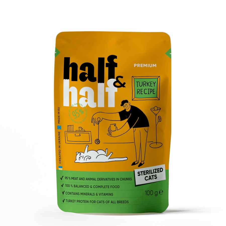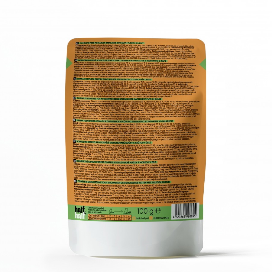 Каталог товаров : Консерви для котів > Вологий корм для стерилізованих котів Half Half шматочки з індичкою в желе 100г