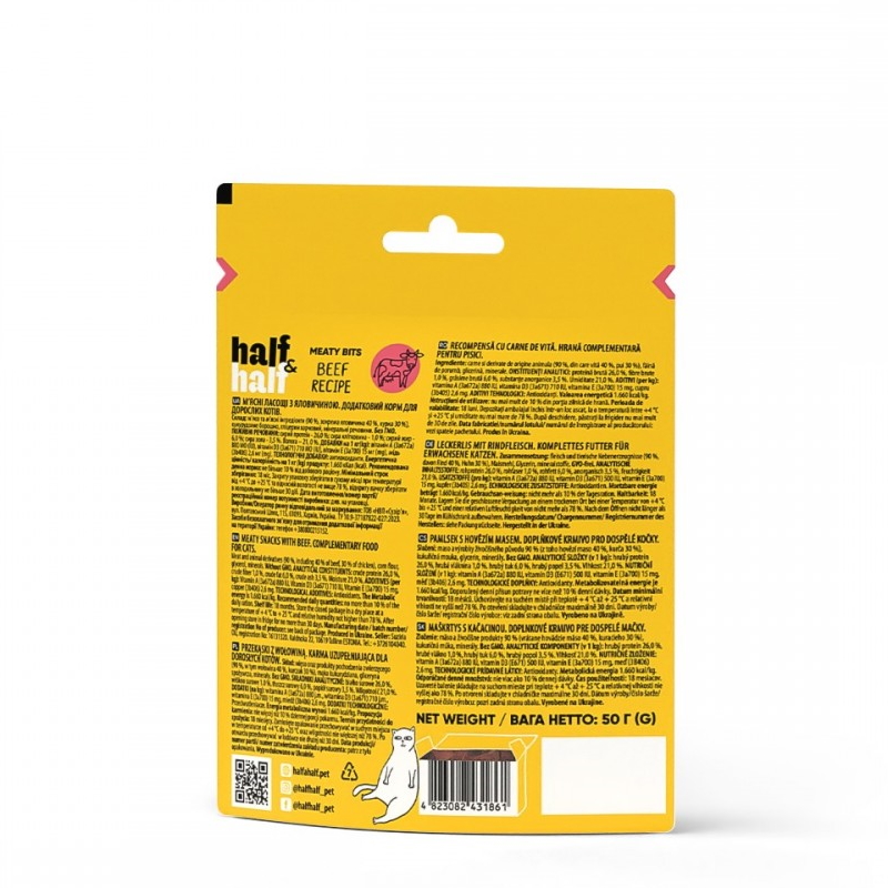 Каталог товаров : Ласощі для котів > Ласощі для котів Half Half м`ясні шматочки з яловичиною 50г
