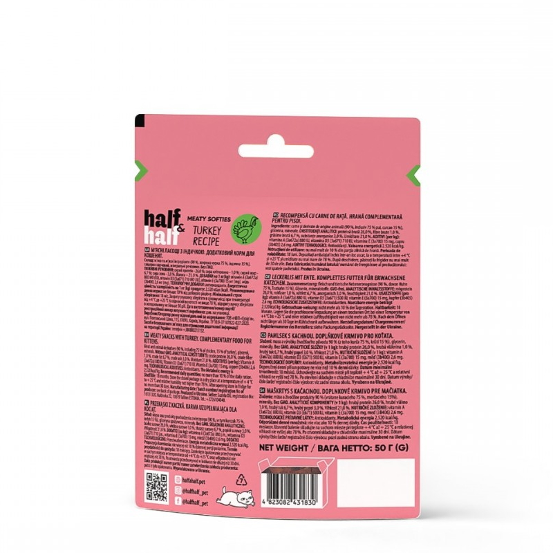 Каталог товаров : Ласощі для котів > Ласощі для кошенят Half Half м`ясні шматочки з індичкою 50г