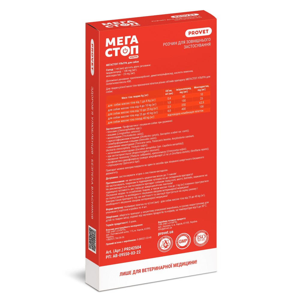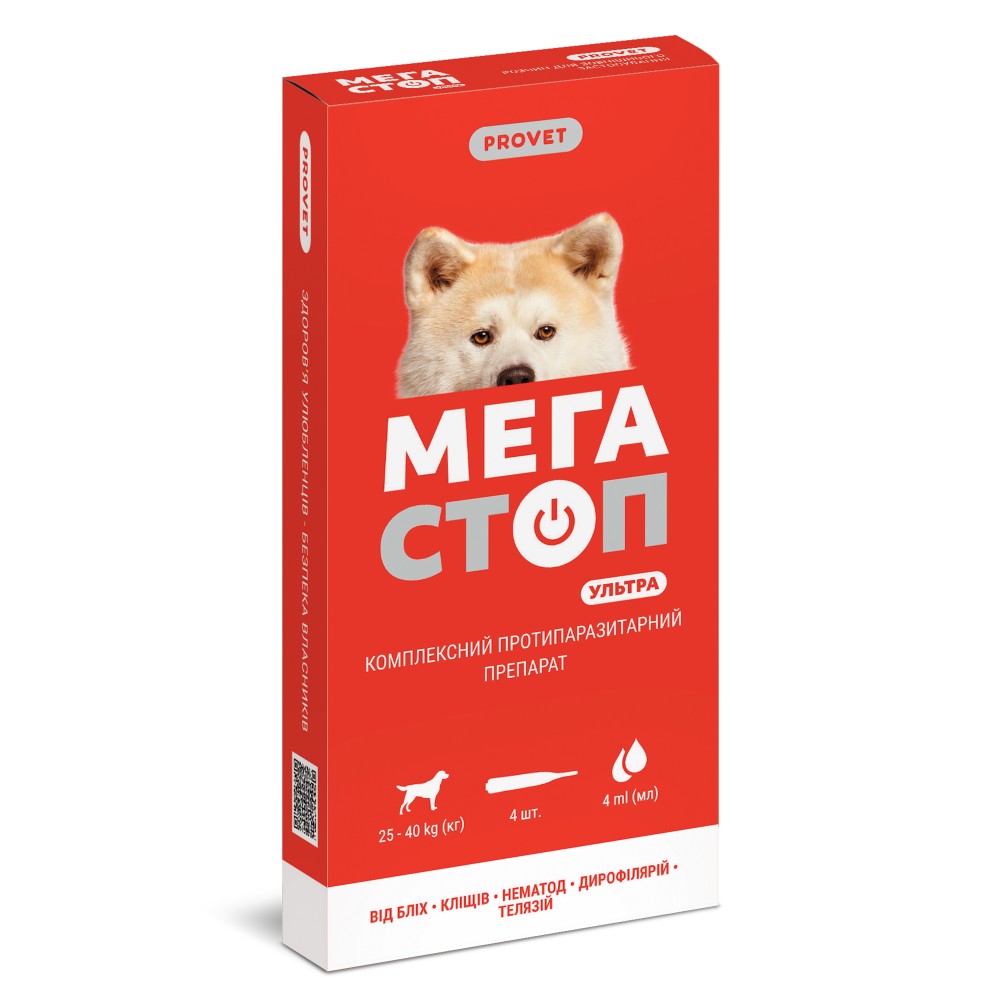 Краплі PROVET Мегастоп Ультра для собак 25-40 кг, 4 піпетки по 4,0 мл (інсектоакарицид, антигельмінтик)