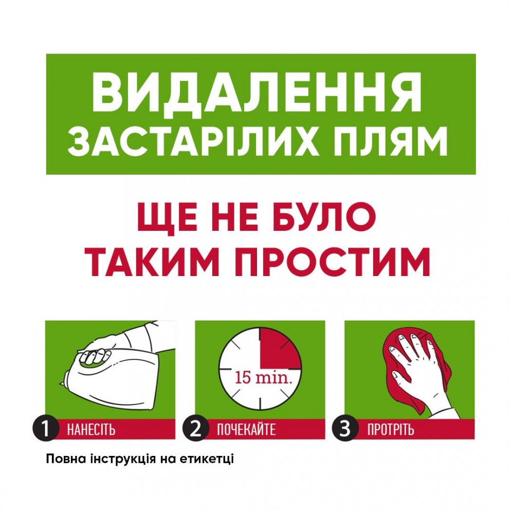 • завжди застосовуйте засіб першим, засоби для виведення плям інших виробників можуть хімічно зафіксувати пляму, і її буде неможливо видалити;