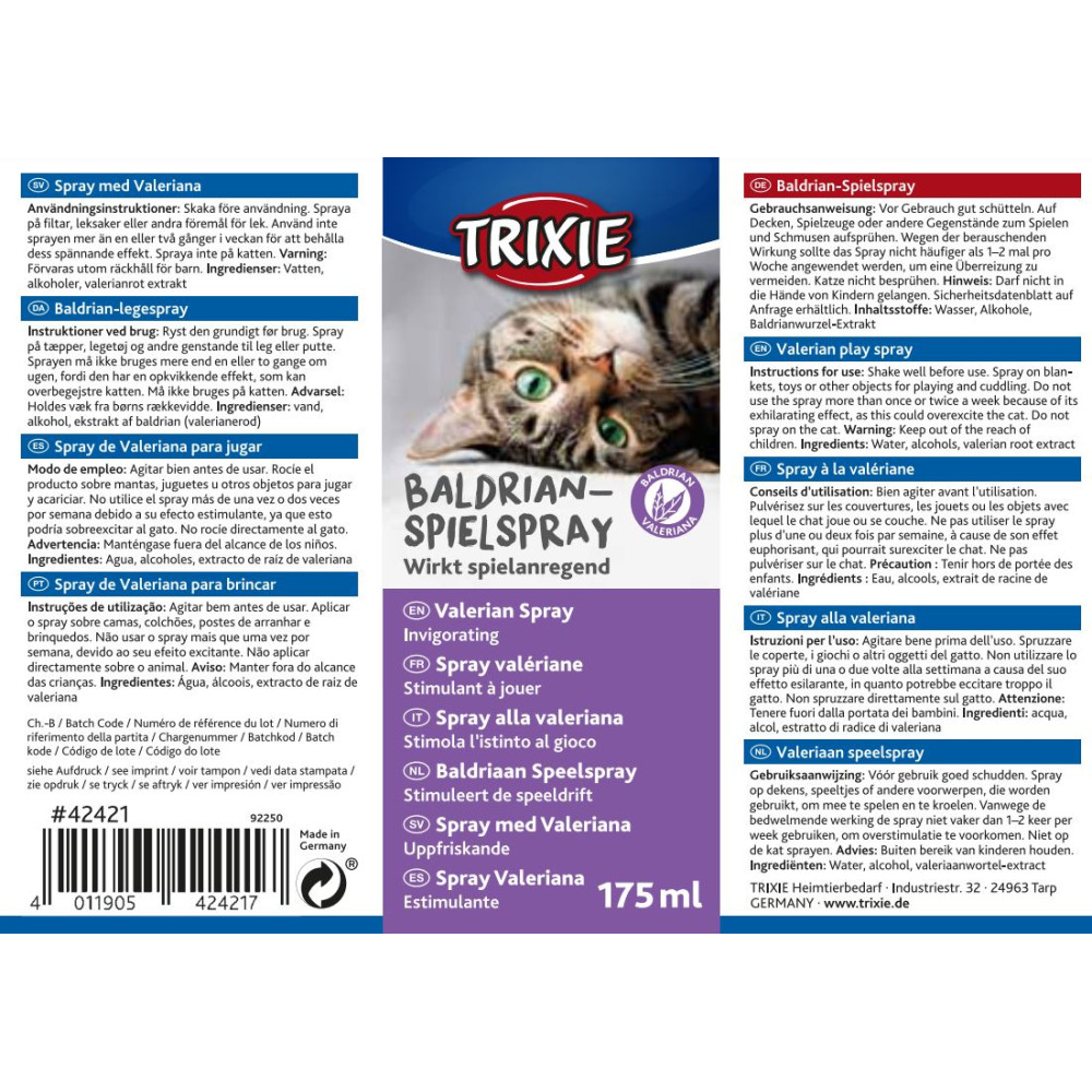 Этот спрей Trixie содержит экстракты валерианы. Trixie Valerian Spray можно использовать как натуральное средство для привлечения кошек к каким-либо предметам, когтеточкам или спальным местам.