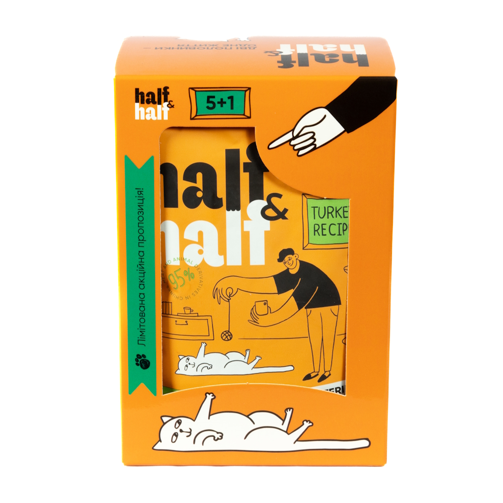 Каталог товаров : Консерви для котів > Набор влажных кормов для стерилизованных кошек Half Half 5+1 с индейкой в желе 6штх100г
