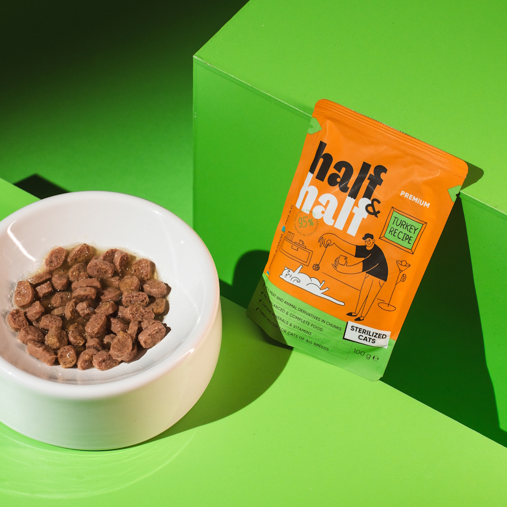 Облегченный по калорийности влажный рацион Half&Half станет отличным диетическим дополнением к сухому корму для стерилизованных малоактивных кошек, в том числе пожилых любимцев.