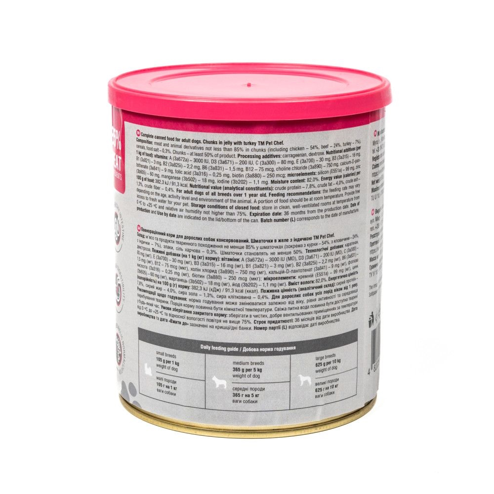 Повнораціонний корм для дорослих собак консервований. Шматочки в желе з індичкою ТМ Pet Chef 800 г