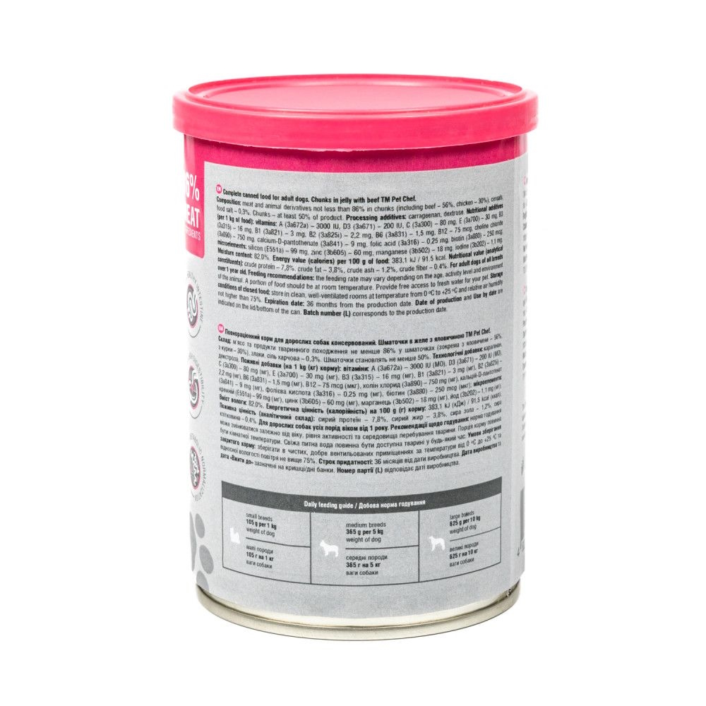 М’ясні шматочки в желе Pet Chef — це збалансований повнораціонний вологий корм для дорослих собак, який є чудовим вибором для тих, хто хоче забезпечити своїх улюбленців смачним та поживним раціоном. Кожен шматочок корму містить мінімум 85% м’ясних інгредієнтів, що задовольнить потреби тварини у білках та енергії, а також оптимальну комбінацію макро- і мікроелементів, вітамінів і амінокислот, необхідних для її розвитку та загального здоров’я. Желе підсилює апетитність, роблячи кожен шматочок надзвичайно соковитим і ароматним.