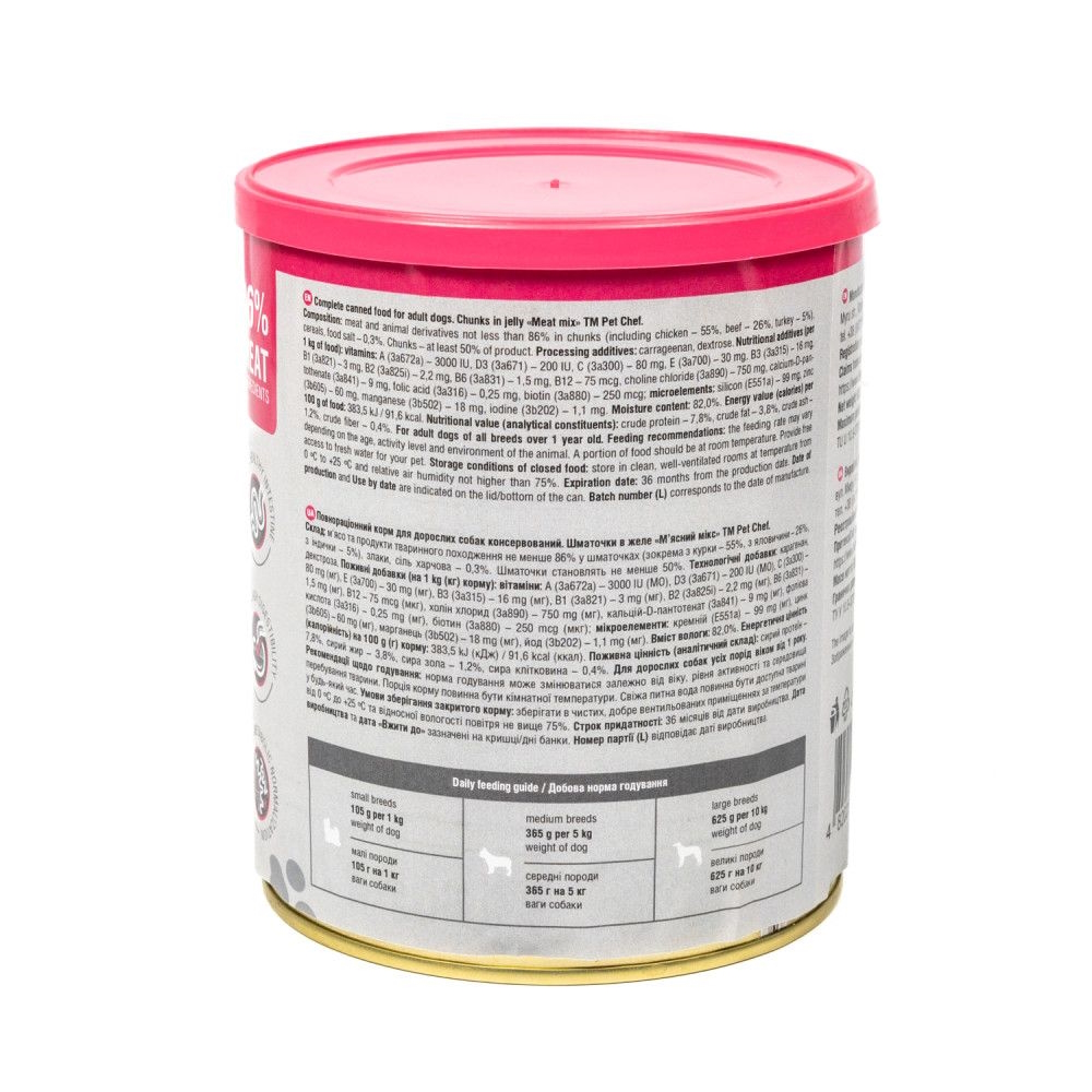 Повнораціонний корм для дорослих собак консервований. Шматочки в желе М`ясний мікс ТМ Pet Chef 800 г