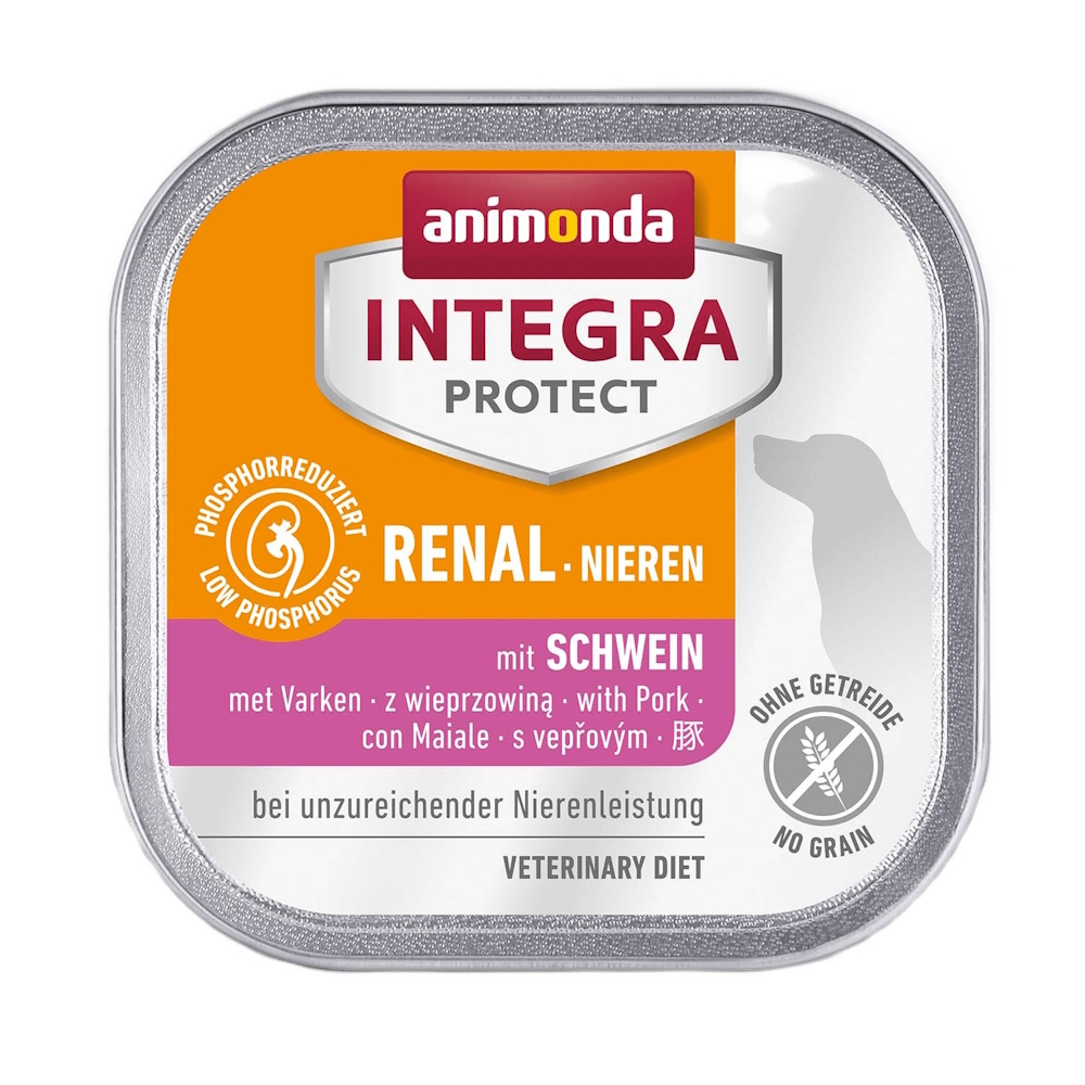 INTEGRA PROTECT Renal зі свининою – спеціальний дієтичний корм суперпреміум класу для собак із хронічною нирковою недостатністю. Цей дієтичний раціон розроблено відповідно до особливих харчових потреб собак із захворюваннями нирок. Він містить менше фосфору, ніж звичайні корми. Це уповільнює прогресування захворювання.