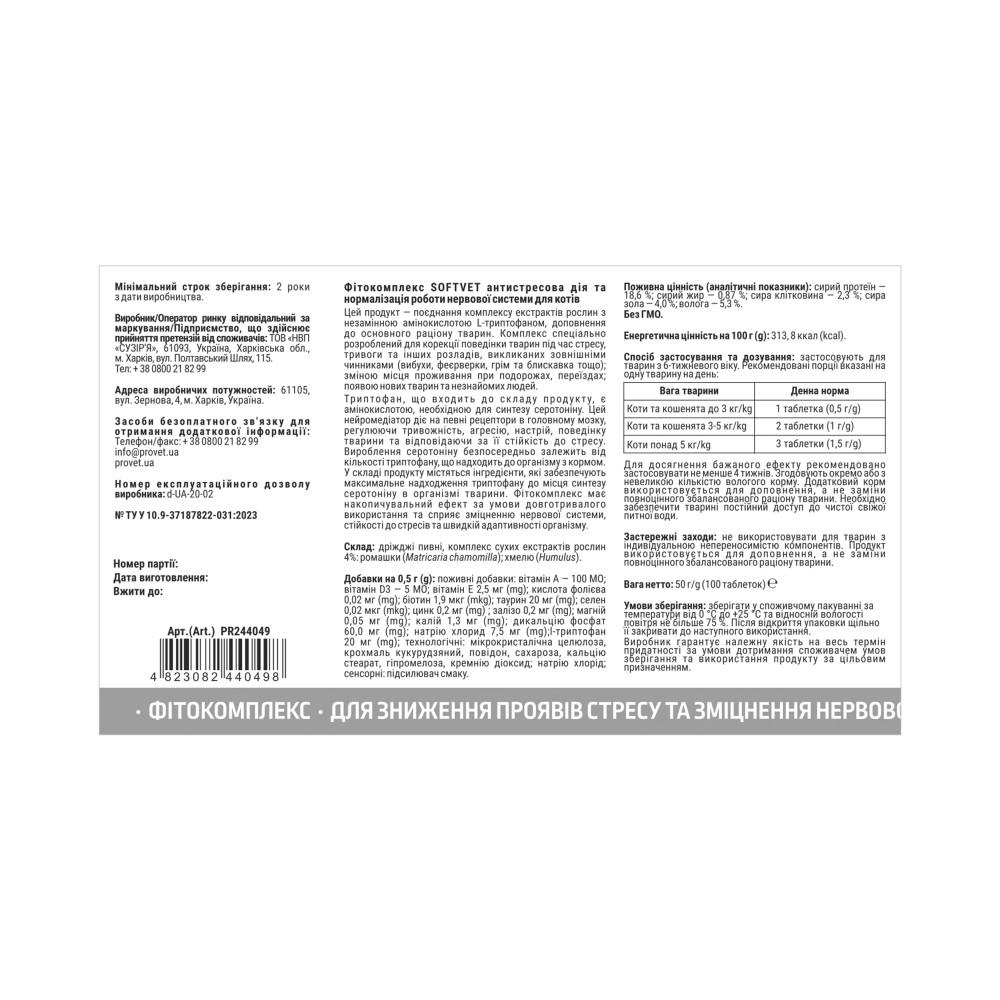 Каталог товаров : Коректори поведінки котів > Антистрес для котів Фітокомплекс PROVET SOFTVET для нормалізації нервової системи 100таб