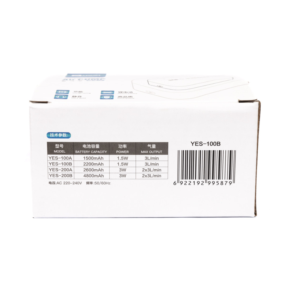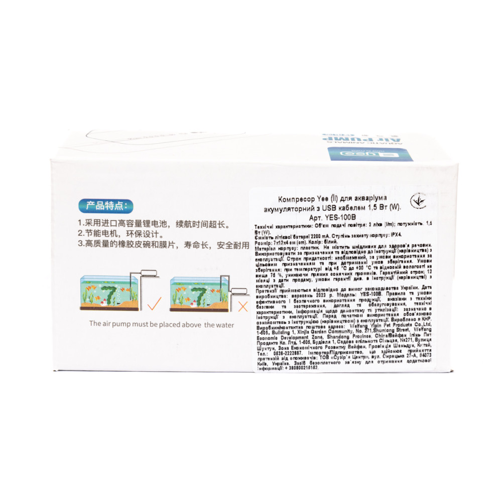 Безшумний акумуляторний компресор YEE з живленням від USB кабелю. Подвійний режим подачі кисню, безперервний (35 годин) та з перервами (70 годин). Може працювати під час зарядки. Система захисту живлення для запобігання перезарядки. Кнопка для перемикання режиму роботи, відповідно до необхідного режиму.