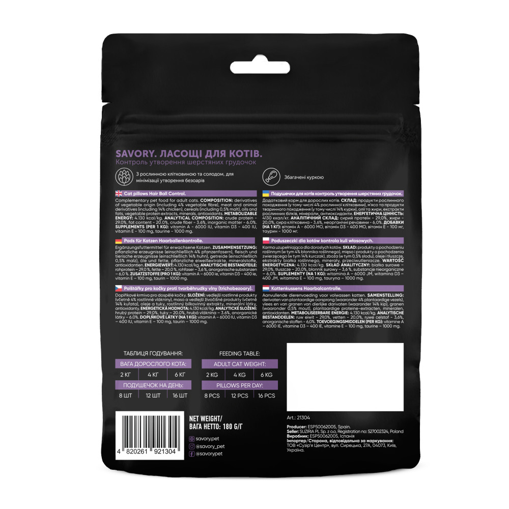 Каталог товаров : Ласощі для котів > Хрумкі ласощі подушечки для виведення шерсті із ЖКТ котів Savory 180г