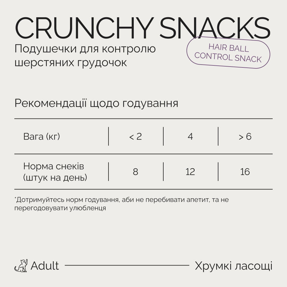 Додаткове харчування з рослинною клітковиною та солодом, що поліпшує перистальтику кишківника, м'яко виводить проковтнуту шерсть природним шляхом та мінімізує утворення безоарів. Хрусткі подушечки покращують кровообіг ясен та механічно очищують зубний наліт. Також добре підходять для літніх вихованців та тих, хто має проблему чутливості зубів.