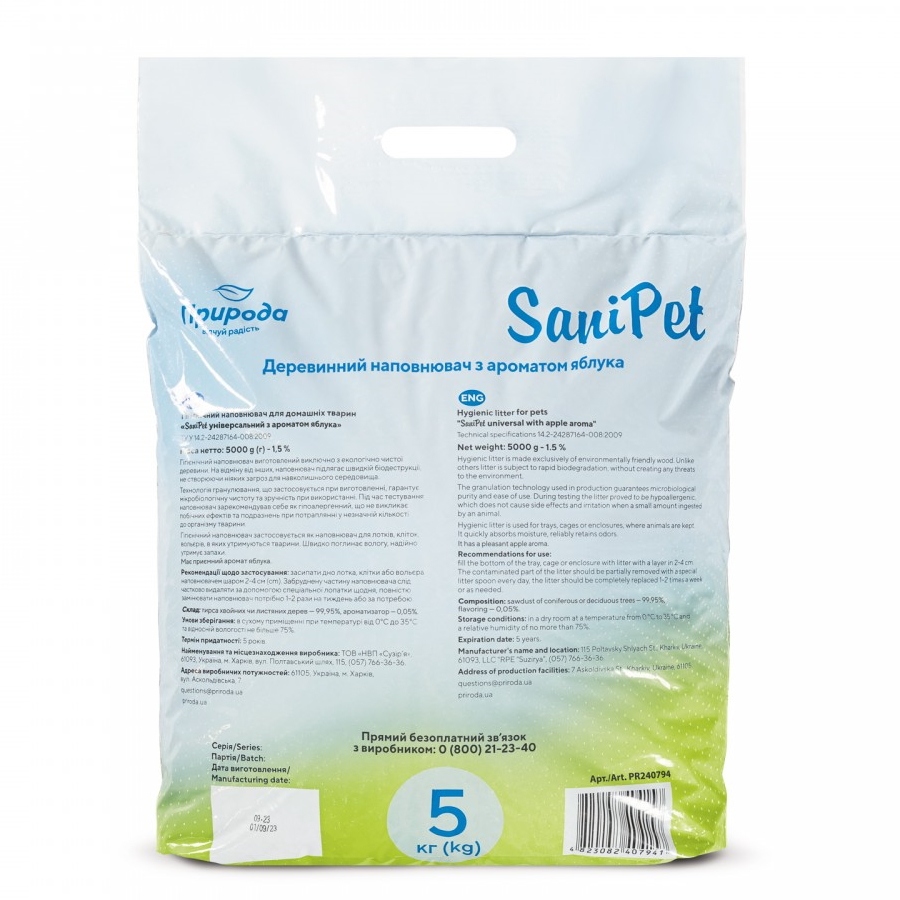 Каталог товаров : Наповнювачі, пакети для котячих туалетів > Гігієнічний деревний наповнювач для котів Природа SaniPet Яблуко 5кг
