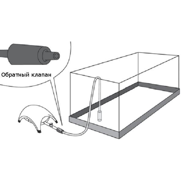 Компрессор TetraTec APS 100 должен быть установлен выше уровня воды в аквариуме. При расположении компрессора ниже уровня воды необходимо установить между компрессором и аквариумом обратный клапан.