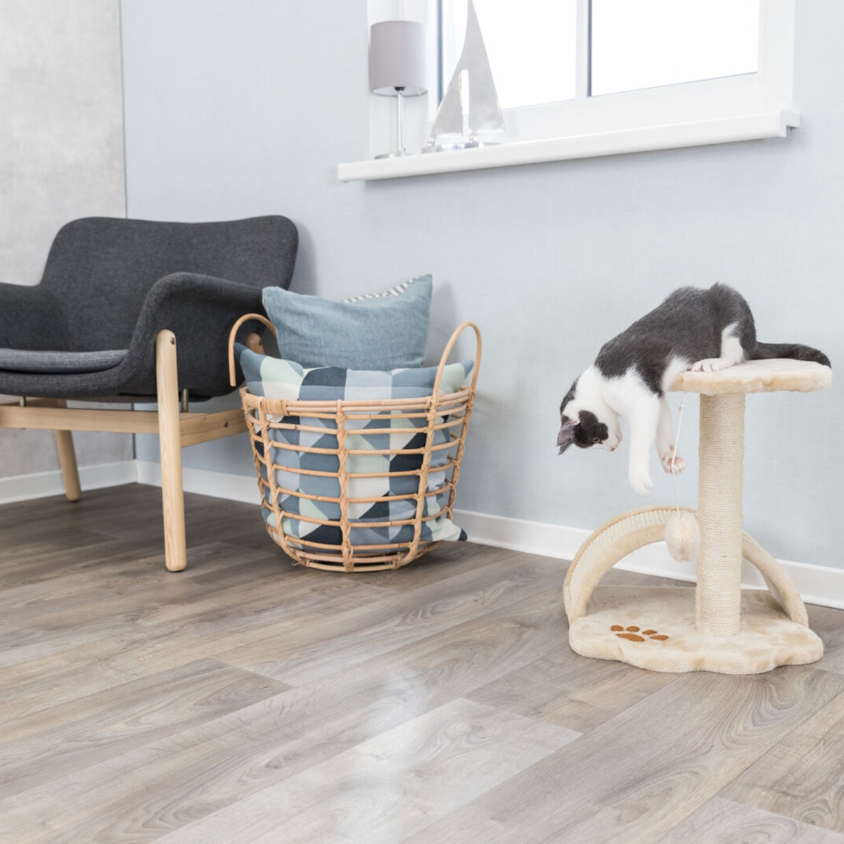 • Оббивка з плюшу (поліестер): 240 г/м² зі вставкою з сизалю для точіння кігтів