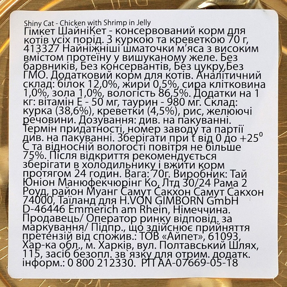 Склад: курка 38,6%, креветки 4,5%, желеутворюючі речовини. Не містить барвників та консервантів. Без ГМО.
