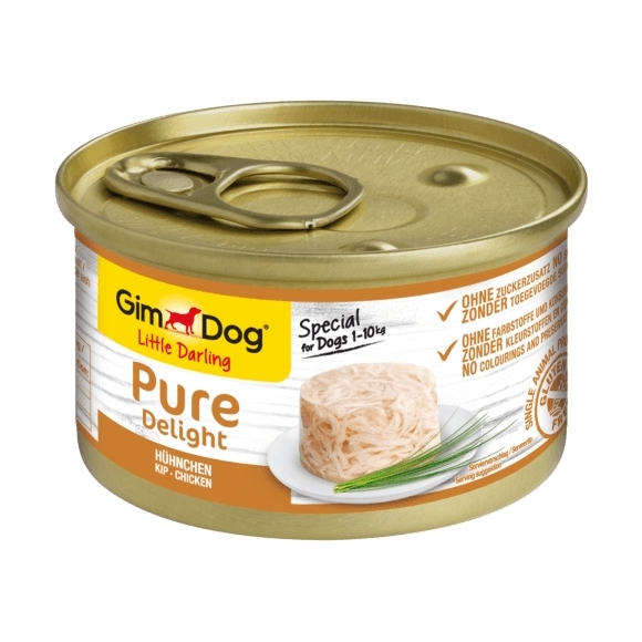 GimDog Little Darling Pure Delight Chicken - консерва с кусочками курицы в желе для собак малых пород (1-10 кг). Нежные, богатые белками кусочки мяса в восхитительном желе. Идеально подходит для собак c чувствительным пищеварением. Без глютена, без консервантов, без пшеницы, без сои, без искусственных цветов, без добавления сахара.