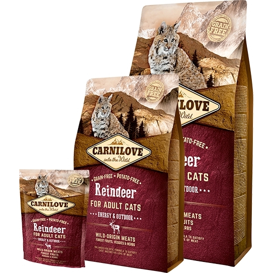 Carnilove Reindeer Energy&Outdoor - полнорационный беззерновой корм с мясом северного оленя и дикого кабана для активных кошек.