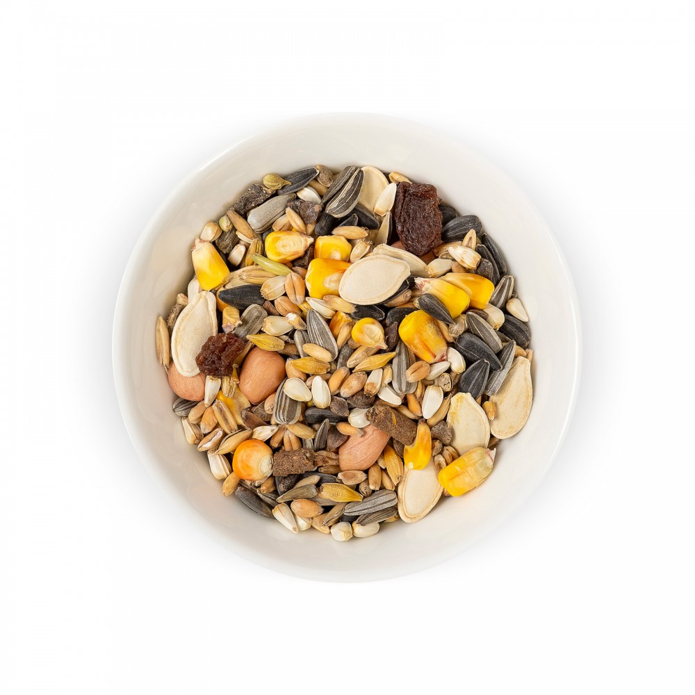 Склад: насіння соняшнику чорного, кукурудза, овес голозерний, пшениця, арахіс, сафлор, насіння соняшнику сірого, гречка, сорго, ячмінь, насіння гарбуза, насіння конопель, яблука сушені гранульовані, кероб, виноград сушений.